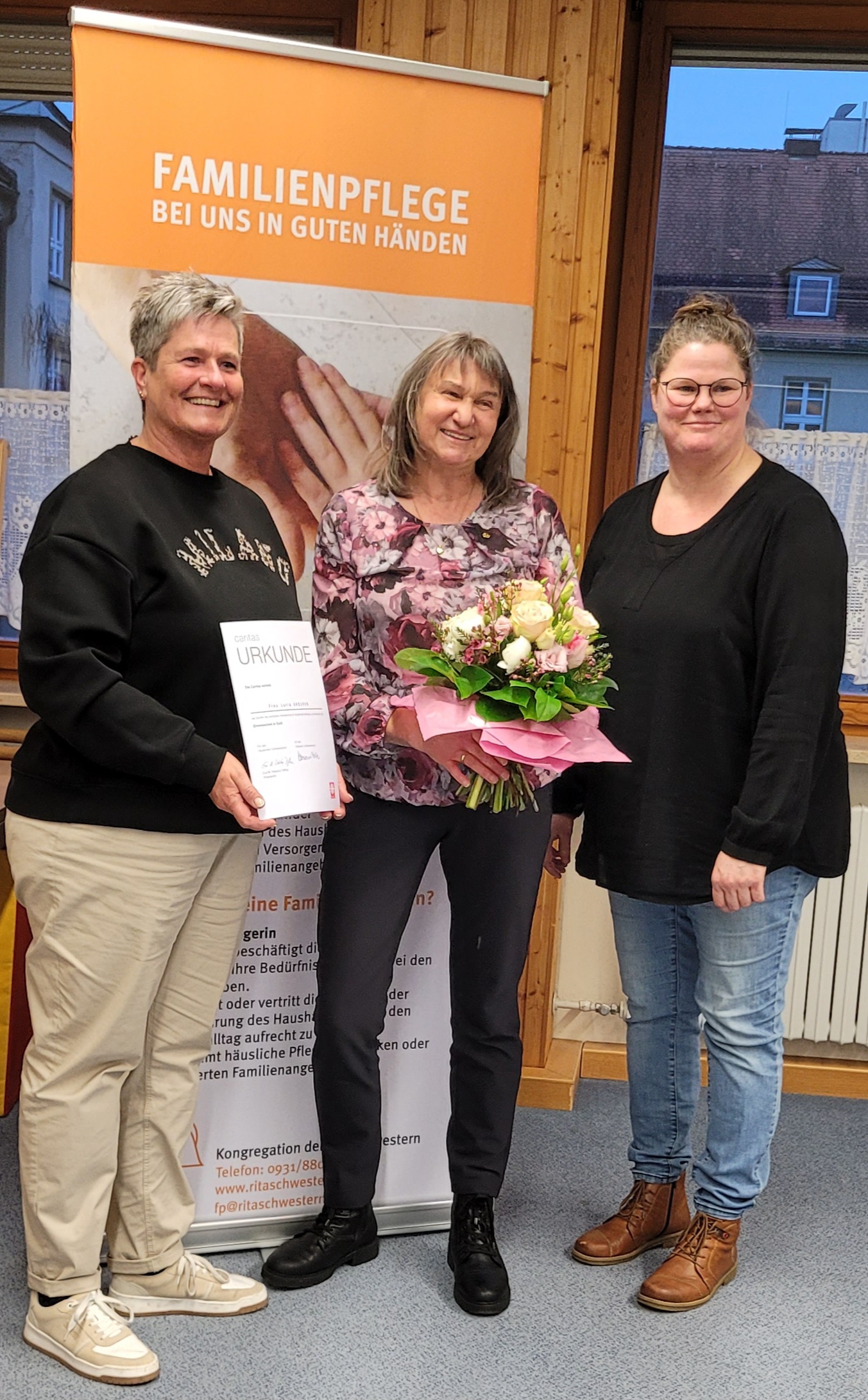 Nach ihrer Ausbildung zur Familienpflegerin an der Fachschule in den Jahren 1980/81 ist Frau Kreußer nun seit 43 Jahren ununterbrochen in diesem herausfordernden Beruf im Einsatz. Ihre Tätigkeit erfordert nicht nur fachliche Kompetenz, sondern auch ein hohes Maß an körperlicher Belastbarkeit, emotionaler Stärke und menschlicher Zuwendung. Über mehr als vier Jahrzehnte hinweg zeichnete sie sich durch außergewöhnliche Verlässlichkeit, großes Verantwortungsbewusstsein und einen unermüdlichen Einsatz für Familien in schwierigen Lebenslagen aus.
