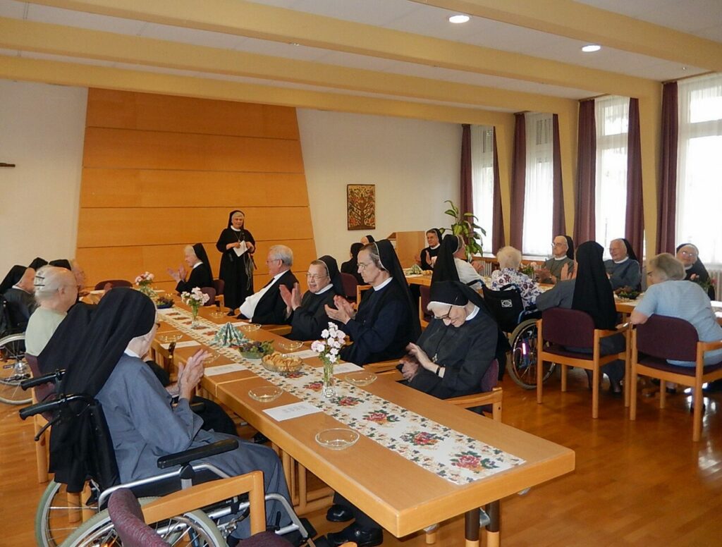 Der Überraschungsgast war Bischof em. Friedhelm Hofmann. Das war ein Hallo. Er hat alle Schwestern einzeln begrüßt und sich mit ihnen unterhalten. Bischof Friedhelm setzte sich mitten zwischen die Schwestern und hat sie bestens und lustig unterhalten und immer wieder den Platz gewechselt. Das war sehr schön. Mancher Witz wurde erzählt und die Stimmung war bestens.