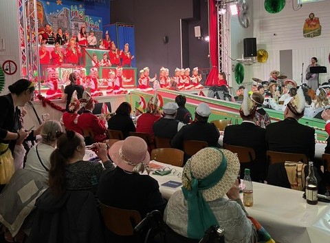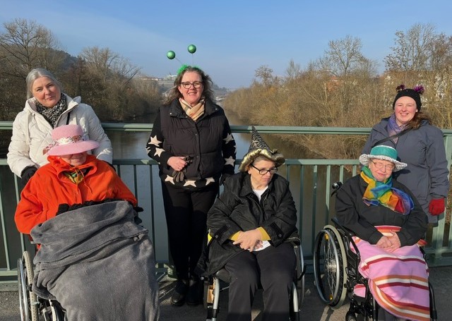 fehlen. Drei Faschings-Begeisterte Schwestern Christine, Magdalena und Perpetua machten sich im Rollstuhl auf den Weg, um bei dieser „Bunten Sitzung“ die Lachmuskel zu trainieren. Begleitet und unterstützt wurden sie von drei Pflegekräften aus dem Haus Hannah.Die Initiatoren Stephan und Stefanie Leutner erwarteten die „Faschingsfreaks“ bereits am Eingang und führten sie an ihre Plätze.