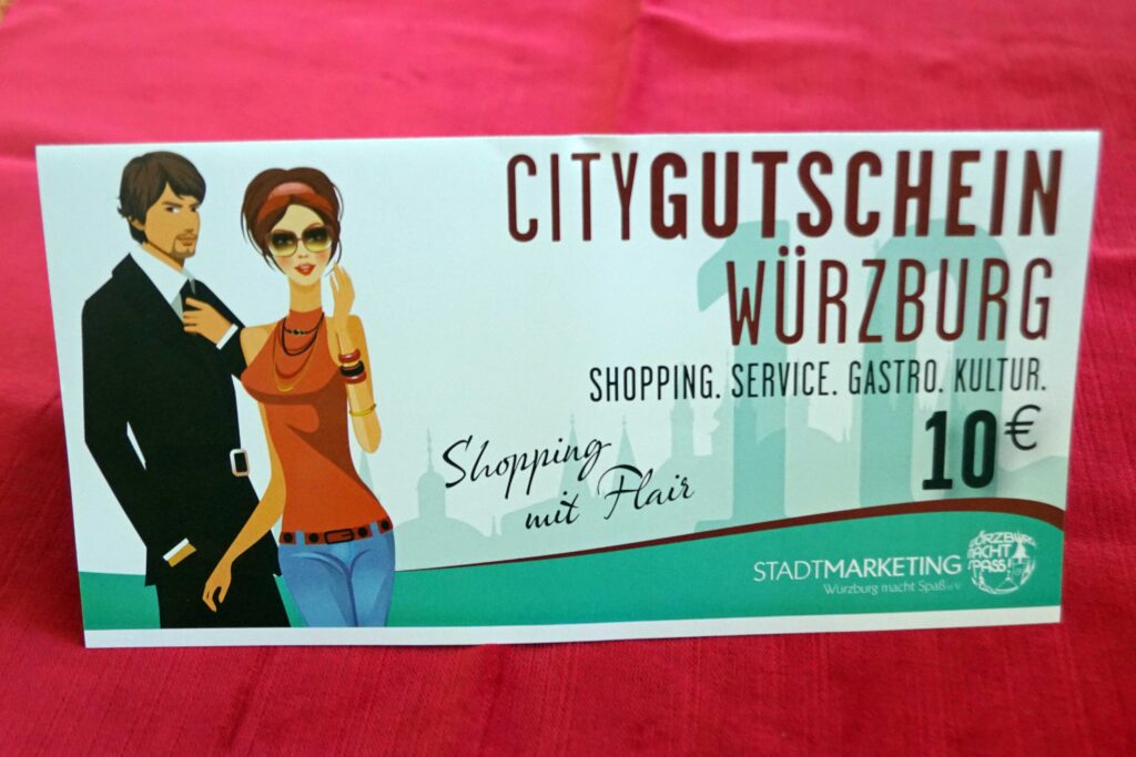 Sich etwas gönnen und damit ein wenig Freude in den Alltag zu bringen, das können die Beschenkten nun individuell machen. Der City-Gutschein kann in über 260 Geschäften, Gaststätten oder Hotels im gesamten Stadtgebiet Würzburg eingelöst werden. Ob Shoppen, Schlemmen, Wellness oder Beauty, die ganze Vielfalt der Einkaufsstadt steht offen.
