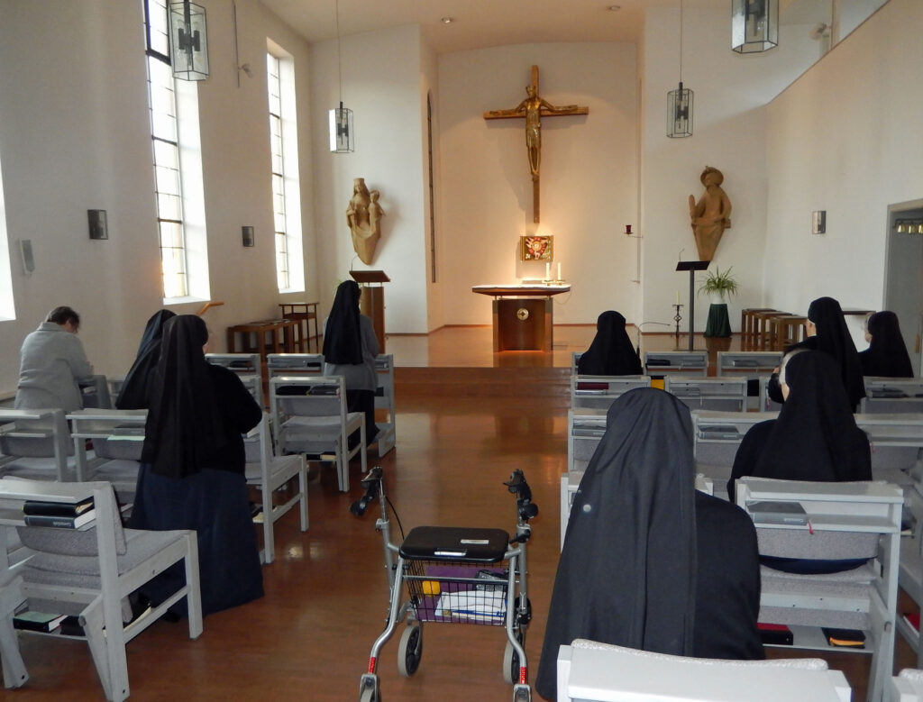 Wir sind dankbar, dass unsere Mitarbeiterinnen und Mitarbeiter in der Küche, im Haus und in der Pflege verantwortungsbewusst ihre Arbeit tun und auch noch alle gesund sind. Wir Schwestern leben hier gemeinsam und der Tag ist durchdrungen von unserem Gebetsleben, dem Stundengebet, wir halten Zeiten des stillen Gebetes, der Anbetung und Wortgottesfeiern.