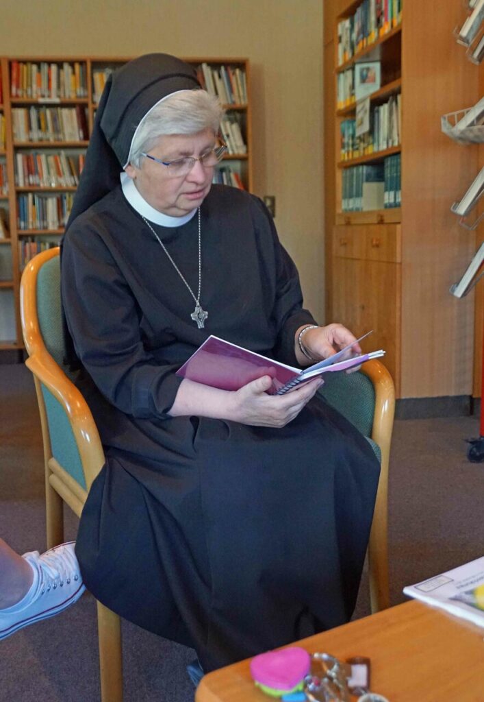 Beim Gesprächstermin am 25. April war eine nette Runde zusammengekommen. Schw. Rita-Maria erklärte, was bei einem Generalkapitel besprochen und entschieden wird, wer daran teilnimmt und wann die Wahlen der Generaloberin und ihrer vier Assistentinnen sind. Sie las aus der Lebensordnung der Ritaschwestern vor und zeigte das Schlussdokument des letzten Generalkapitels vor sechs Jahren. Die anwesenden Mitarbeiterinnen nutzten das Gesprächsangebot für Rückfragen.