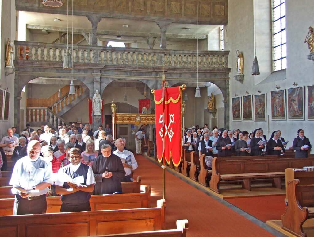 Die Kirche des ehemaligen Zisterzienserinnen-Klosters von Frauenroth war bis auf den letzten Platz gefüllt, als dann 10 Priester und ein Diakon einzogen und eine festliche Eucharistiefeier konzelebrierten. In der vor ein paar Jahren wieder frisch renovierten romanischen Kirche erschallten aus kräftigen Kehlen gesungene moderne und traditionelle Kirchenlieder, die von der Empore her beeindruckend unterstützt wurden durch die Musikgruppe „Nur Mut“ aus Stralsbach.