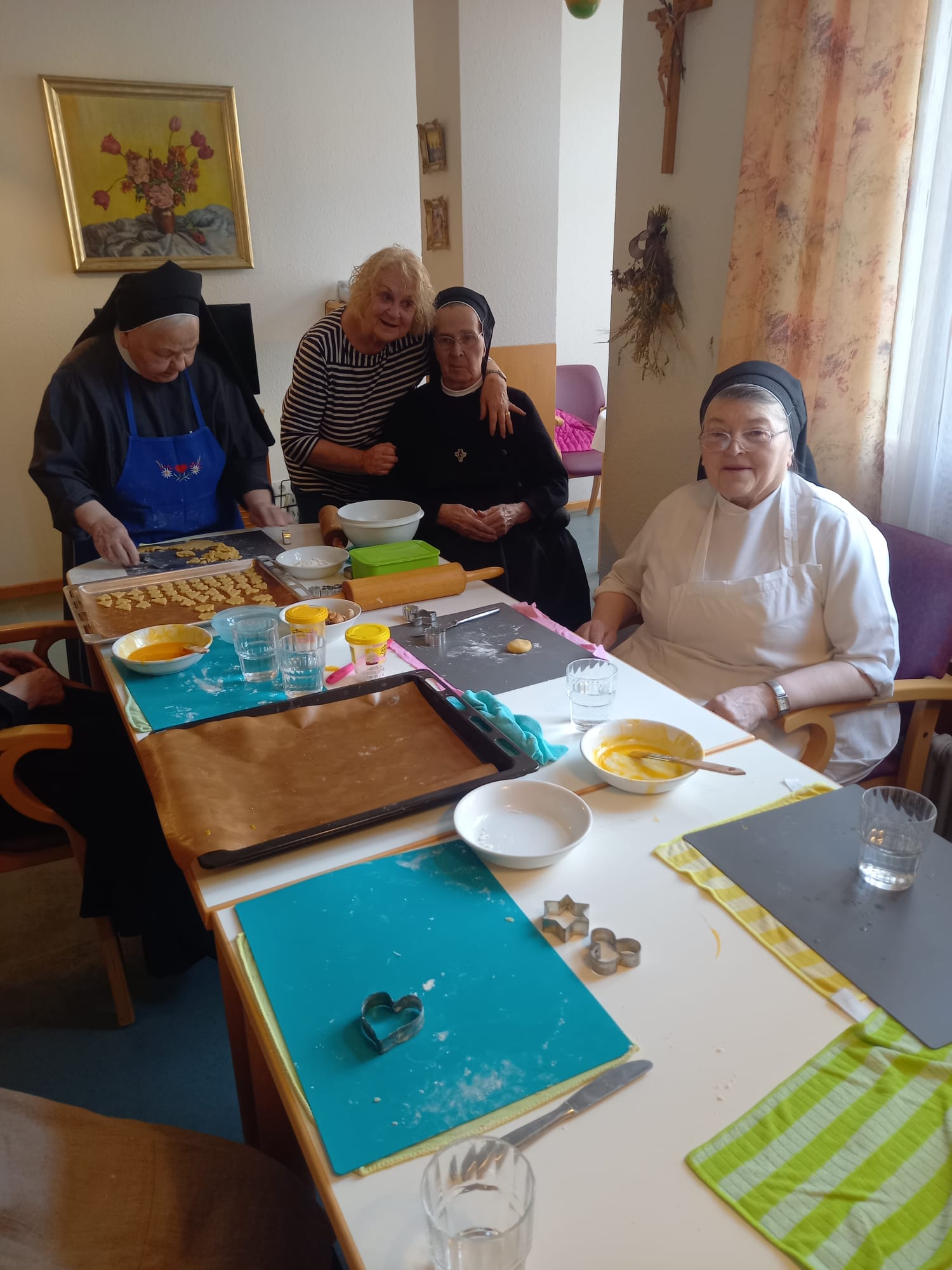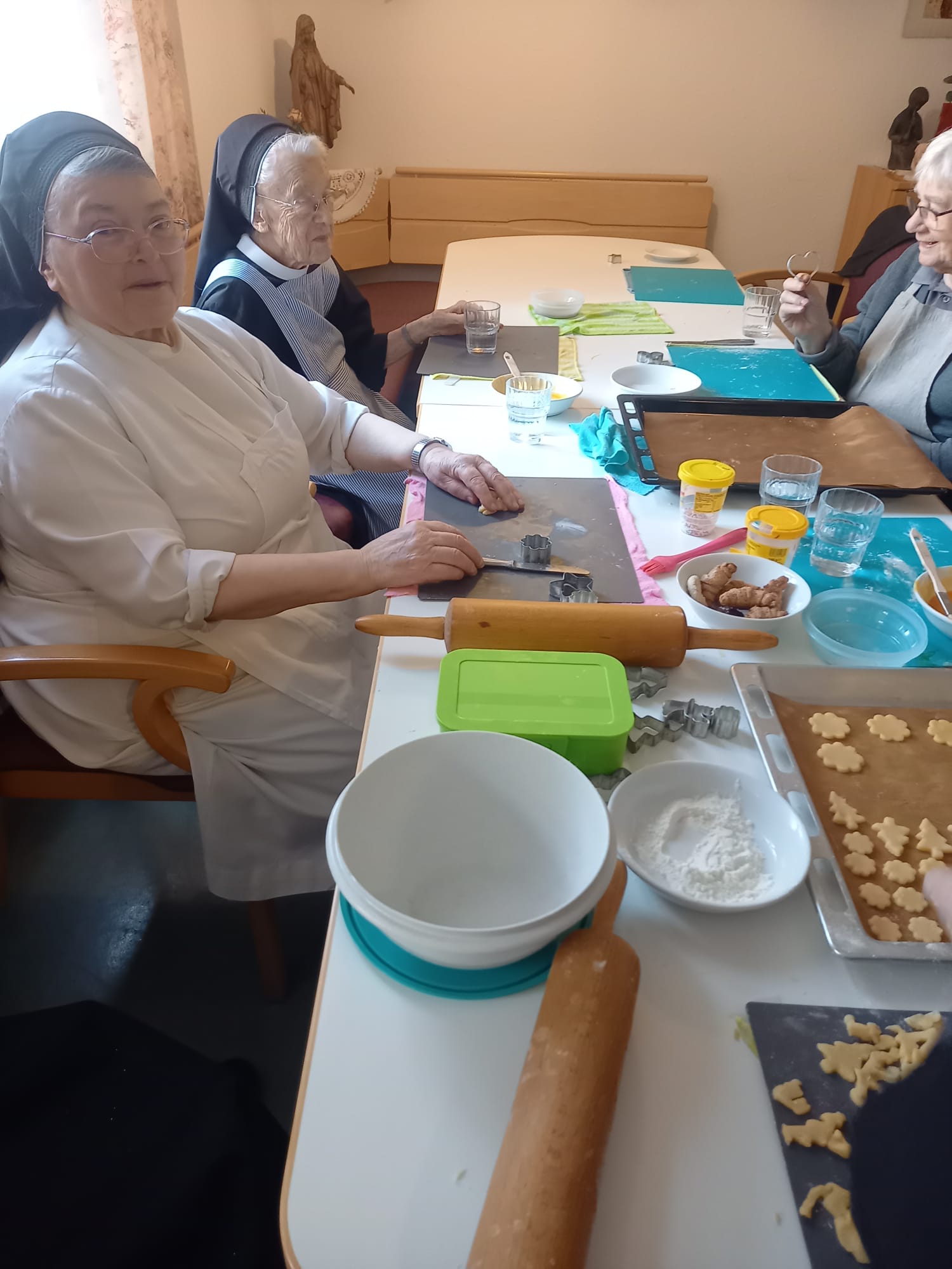 Eifrige Plätzchenbäckerinnen waren am Werk und der Duft von frisch gebackenen Plätzchen erfüllte nach kurzer Zeit das Haus Hannah. Die ehrenamtlichen Mitarbeiterinnen Hilde Mantel und Marie Theres Schenk waren gekommen, um mit einigen Ritaschwestern Plätzchen zu backen.
