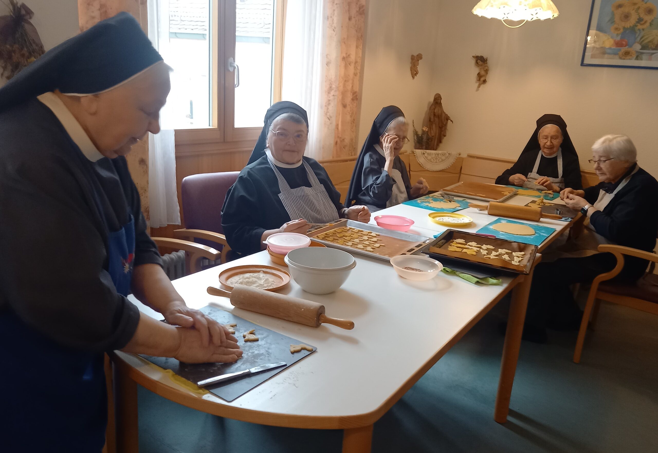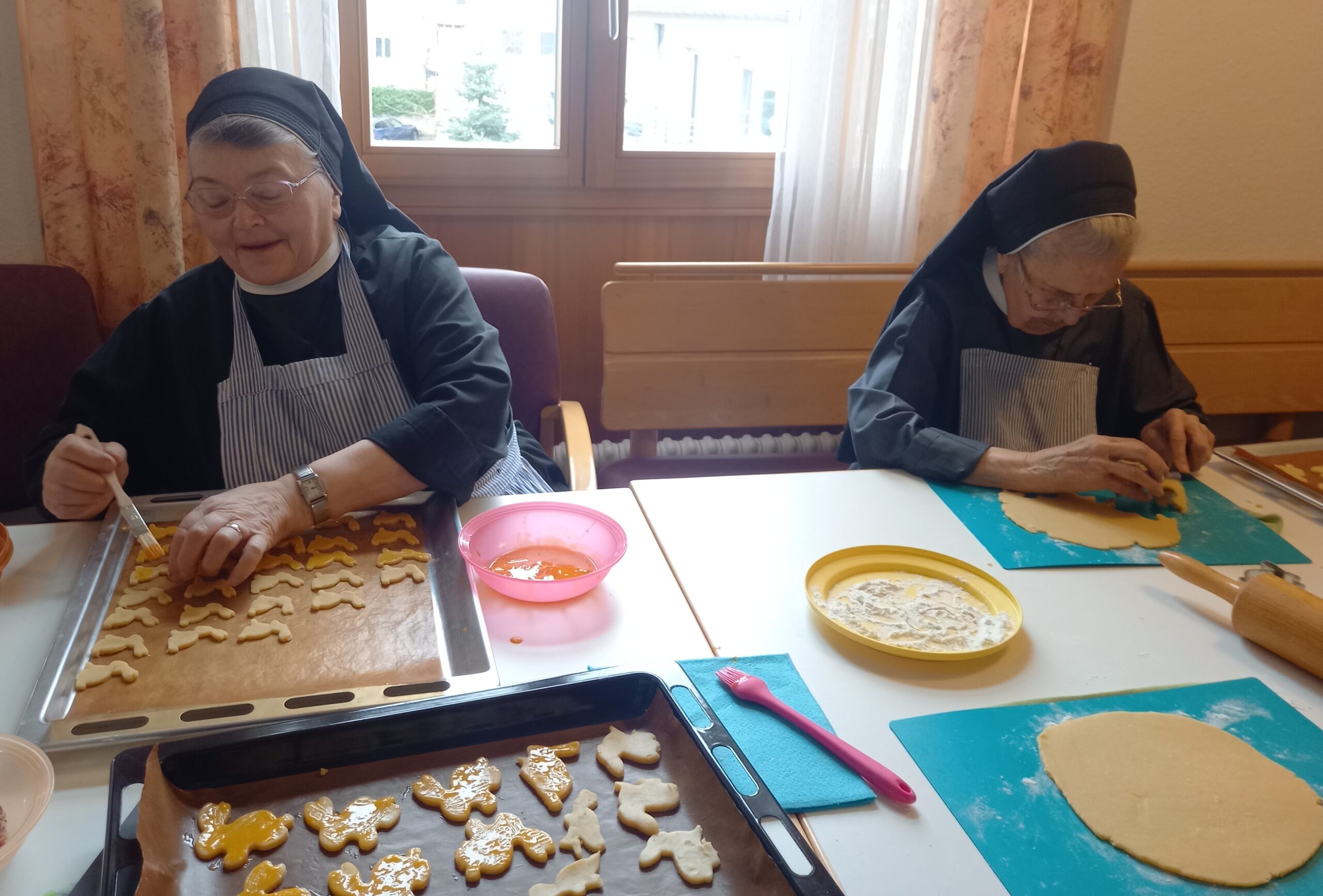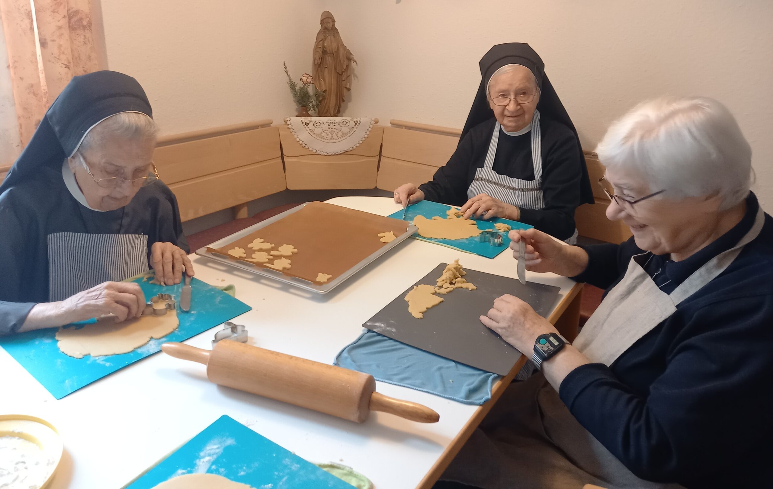 Eifrige Schwestern waren am Werk und der Duft von frisch gebackenen Osterhasen erfüllte nach kurzer Zeit das Haus Hannah. Die ehrenamtlichen Mitarbeiterinnen Hilde Mantel und Marie Theres Schenk waren gekommen, um mit einigen Ritaschwestern zu backen.